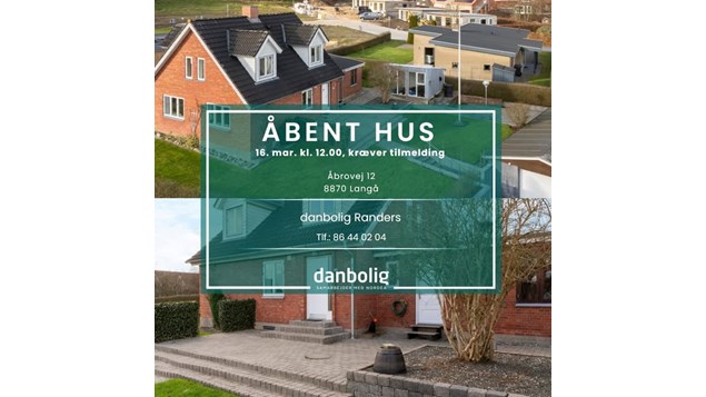 Danbolig Randers inviterer til åbent hus på en moderne og rummelig villa på Åbrovej 12 i Langå. Arrangementet kræver tilmelding og finder sted den 16. marts kl. 12.00. For mere information kan du læse det oprindelige opslag.